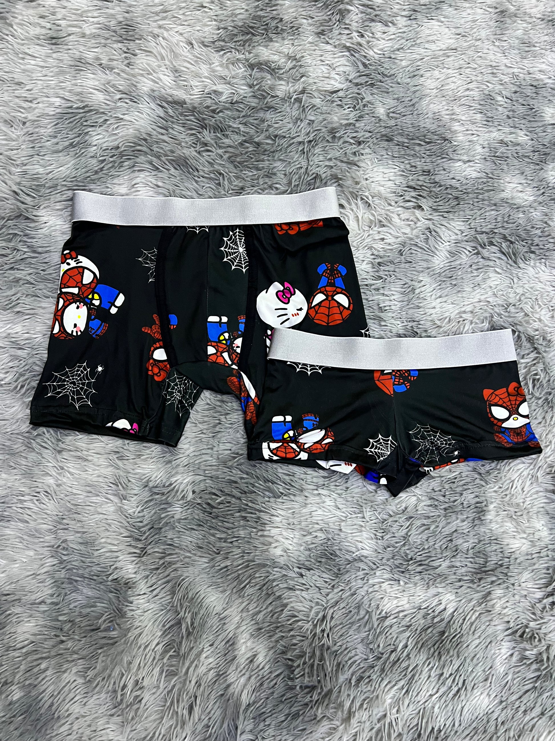 Hello kitty and Spiderman white spiderwebs black background matching couples boxer underwear