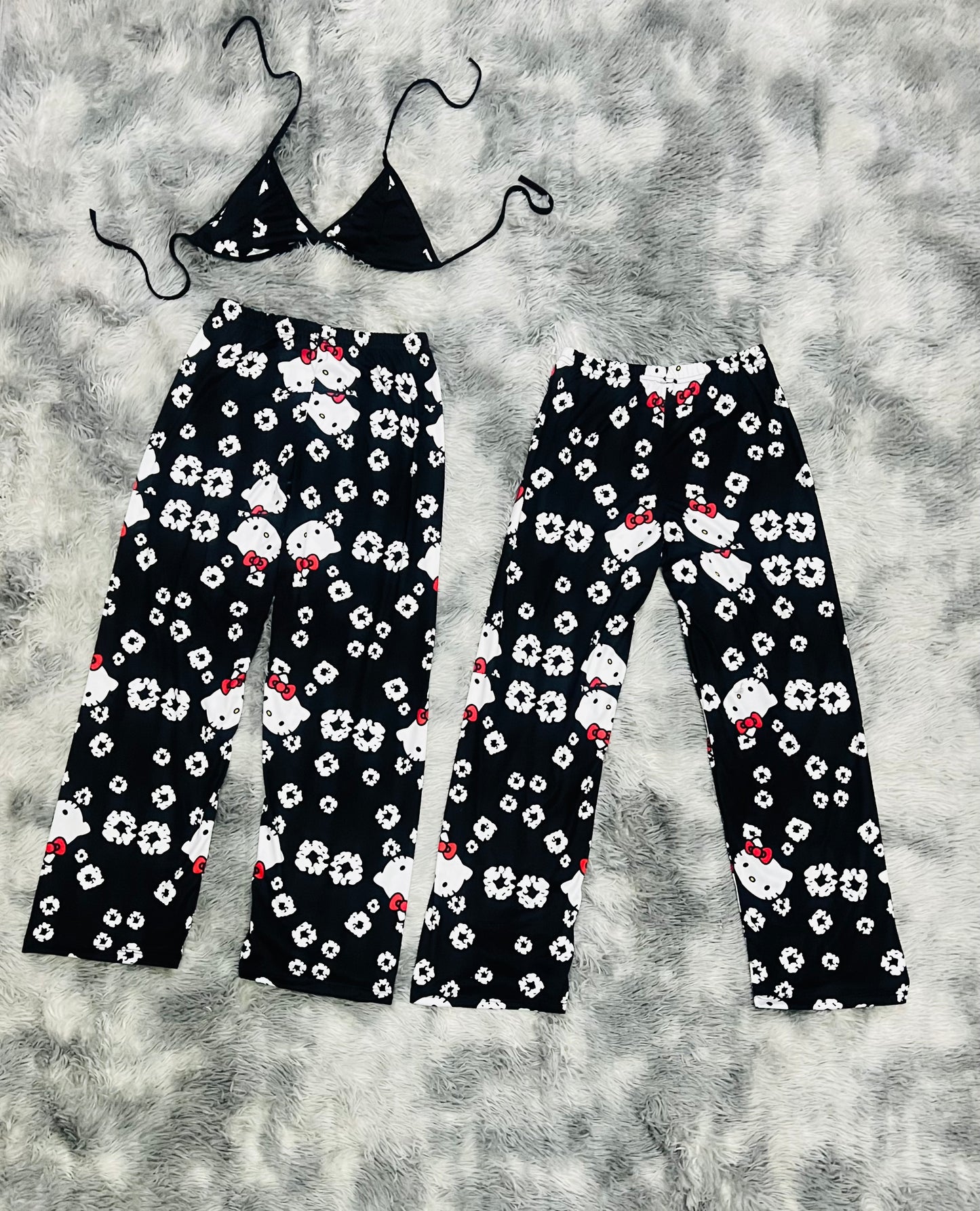 Kitty and Flowers Black Background plush pajama duo