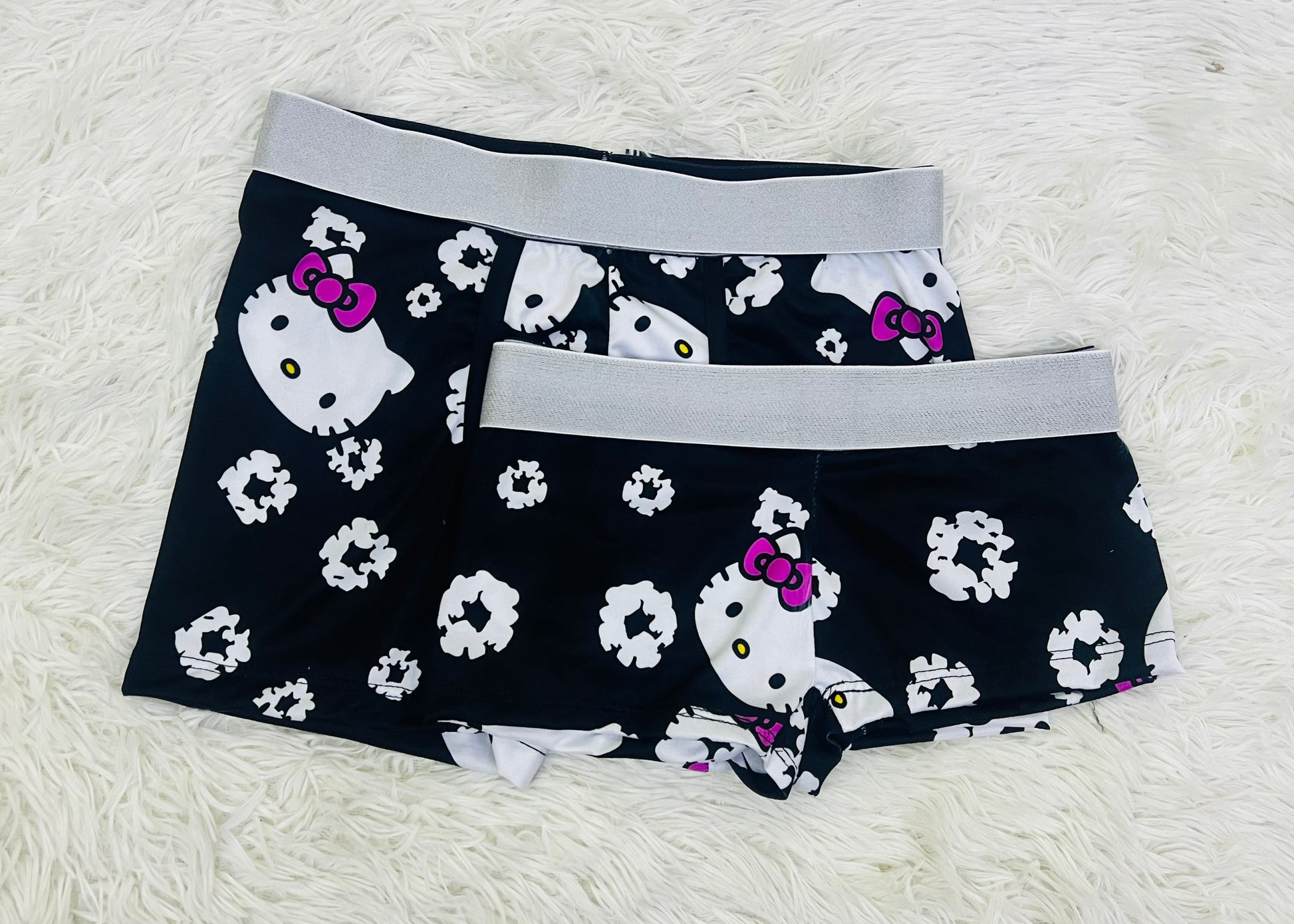 Kitty Pink bun and Flowers Black Background matching couples boxer underwear